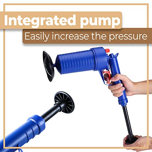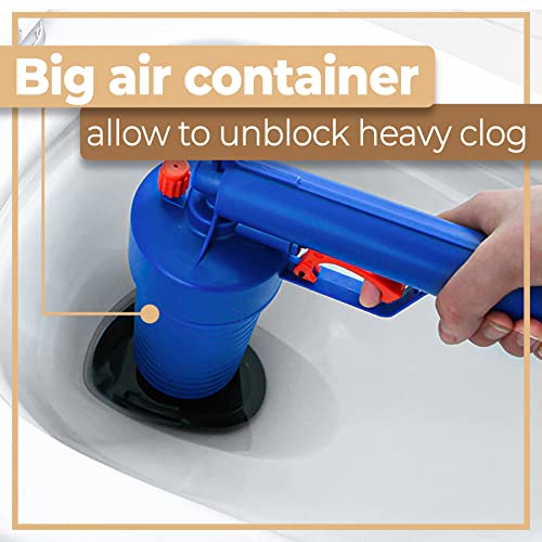 Ergonomische handgreep: de pistoolvormige handgreep is zo ontworpen dat de gebruiker tijdens het gebruik een stevige grip heeft. De drukpomp heeft geen stroombron nodig en is daarom draadloos te gebruiken. Met behulp van de hogedrukluchtstroom is het pistool in staat om alle soorten verstoppingen te elimineren. Papieren handdoeken, wisdoeken, gedroogd vet, olie of haar zijn geen probleem voor hem.