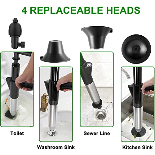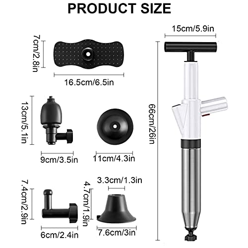 Specification: Toiletplunjer, luchtafvoerblasterset, verstoppingsverwijderaar met 4 vervangbare koppen en visuele barometer, roestvrijstalen toiletontstopper voor verstopte toiletgootsteen Rioolpijpzuiger (White)