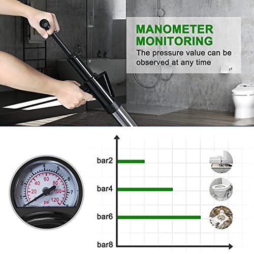【Realtime druk】 De toiletplunjerafvoerbagger heeft een naar boven ontworpen luchtdrukindicator, zodat we de pneumatische activiteit en realtime luchtdrukwaarde kunnen observeren, wat handiger voor u is om aan te passen aan verschillende vereisten om spatten te voorkomen water en schade veroorzaakt door overmatige kracht.