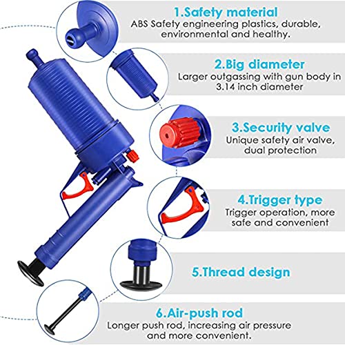 [Ergonomische handgreep]: gehumaniseerd pomphandvat, comfortabel in de hand. De afvoerplunjer gebruikt de kracht van perslucht onder hoge druk om de ernstigste verstoppingen snel en eenvoudig weg te blazen met een enkele trekker.